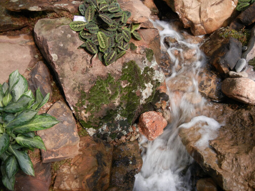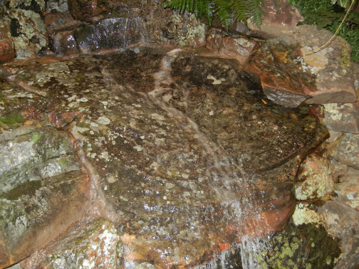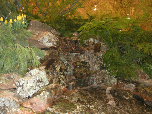 You can't have an oriental garden without evergreen shrubs trimmed in a bonzai fashion and gravel and sand carefully raked in mesmerizing lines. Water features were everywhere, this water feature was unique in the texture of the water.  |